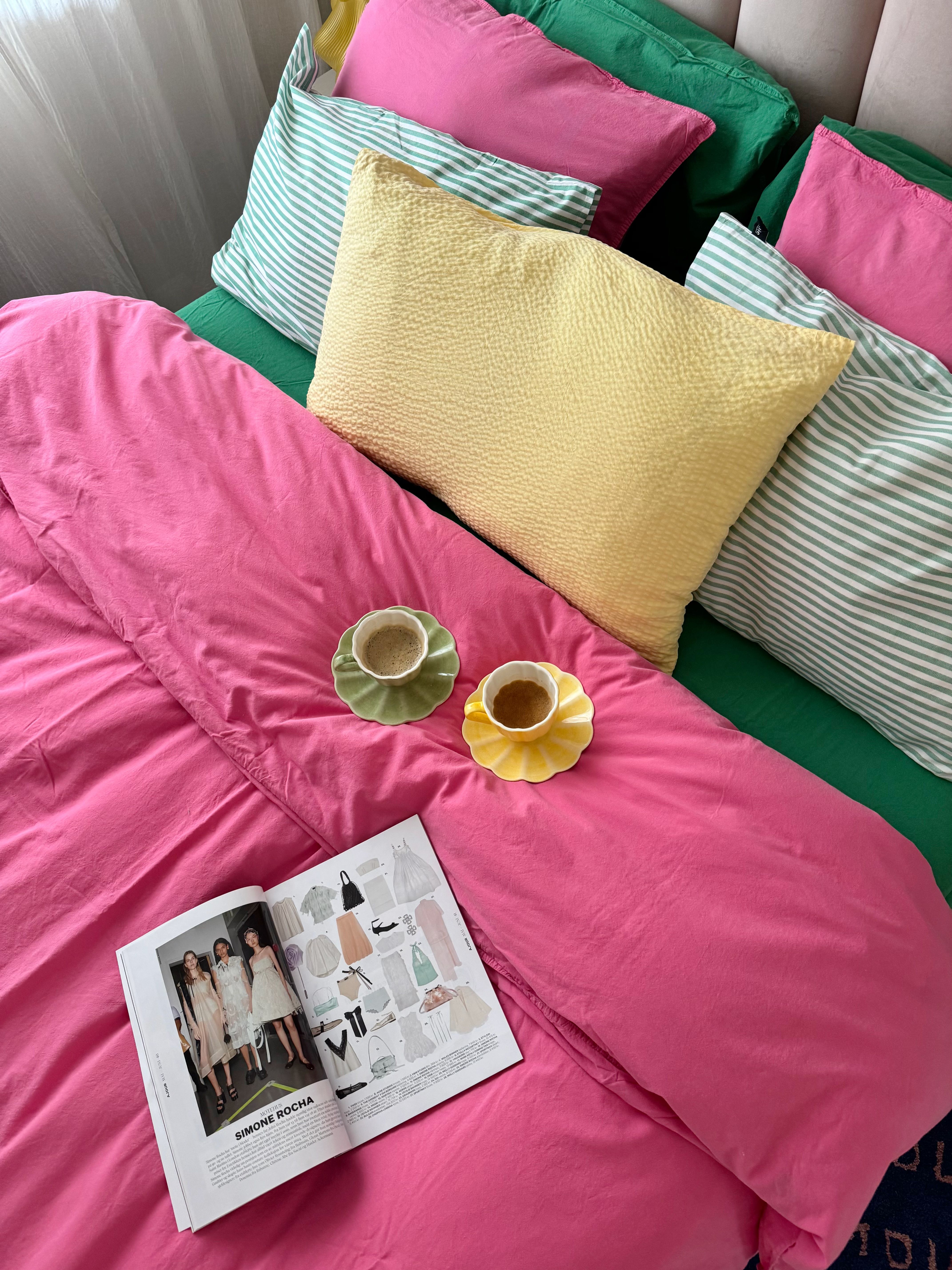 Mitt sengetøy hjemme består 90% av Høie så jeg føler jeg kjenner de ulike type sengetøyene ganske godt. Her har jeg valgt sengetøy ene og alene basert på farger, for man trår sjeldent feil med kvaliteten til Høie uansett. Jeg tror faktisk favoritten min i sommer blir det gule i krepp, fordi krepp er det beste å sove i om sommeren! Men å velge mellom fargene grønn, gul og rosa - det klarer jeg ikke