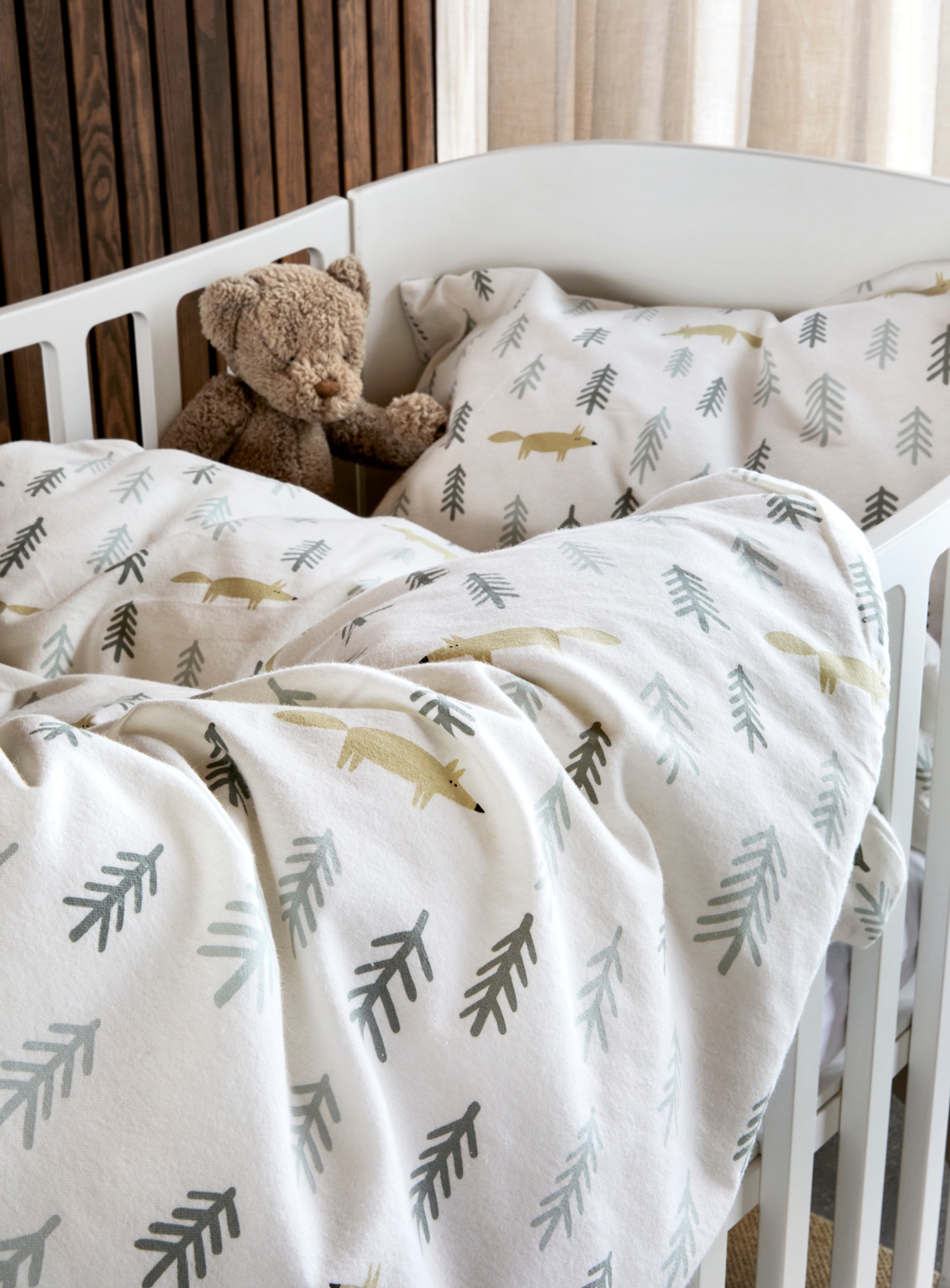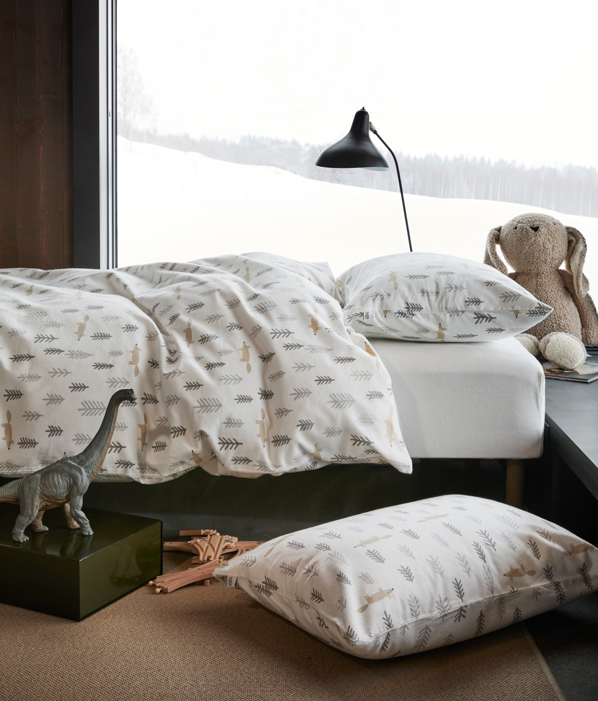 Sengesettet Skogstur i flanell gir barnerommet et snev av eventyr som inspirerer til drømmende reiser gjennom skogens mysterier. Den unike flanellfølelsen kommer når man børster overflaten på den fine bomullen. Det gjør at flanellen oppleves lun og myk. Det søte og lekne designet gir en koselig atmosfære på barnerommet.