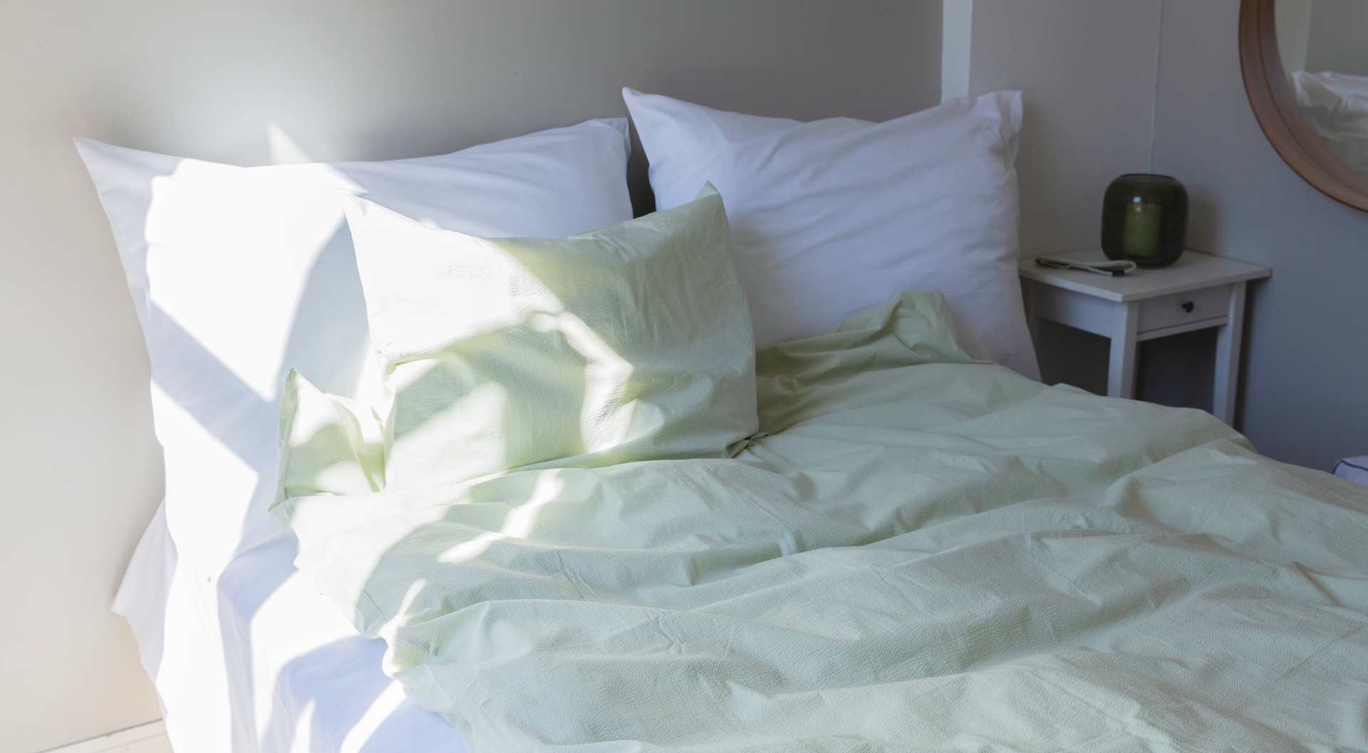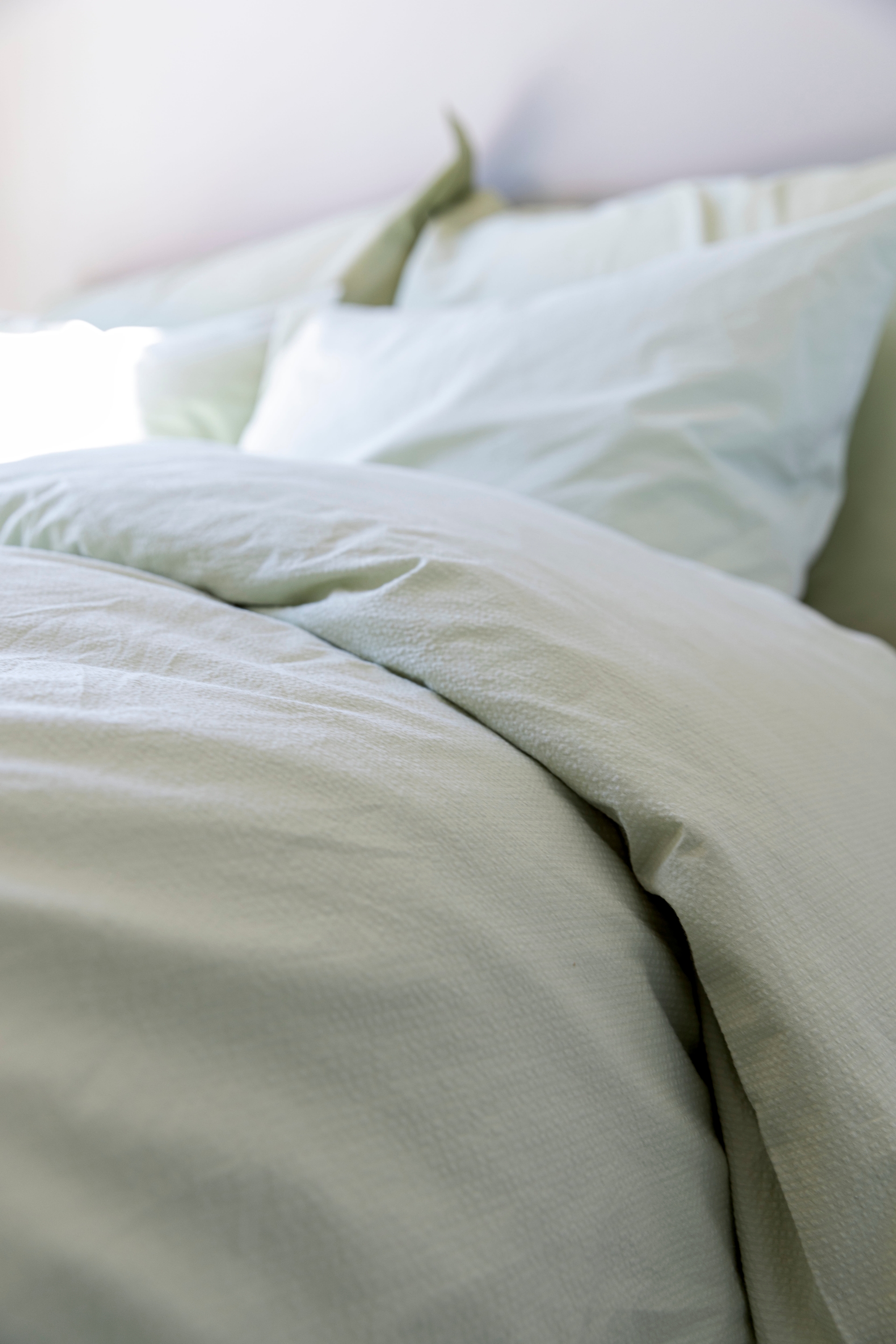 - Jeg liker å bytte fra vinterdyne til en lettere vårdyne, da sover jeg mye bedre. I tillegg elsker jeg å kle dynene i et luftig og friskt vårlig sengetøy med herlige og sommerlige farger. Krepp synes jeg er helt perfekt til sommeren ettersom det gir en mye svalere følelse mot huden, og akkurat nå er jeg forelsket i den vårgrønne fargen fra Høie.