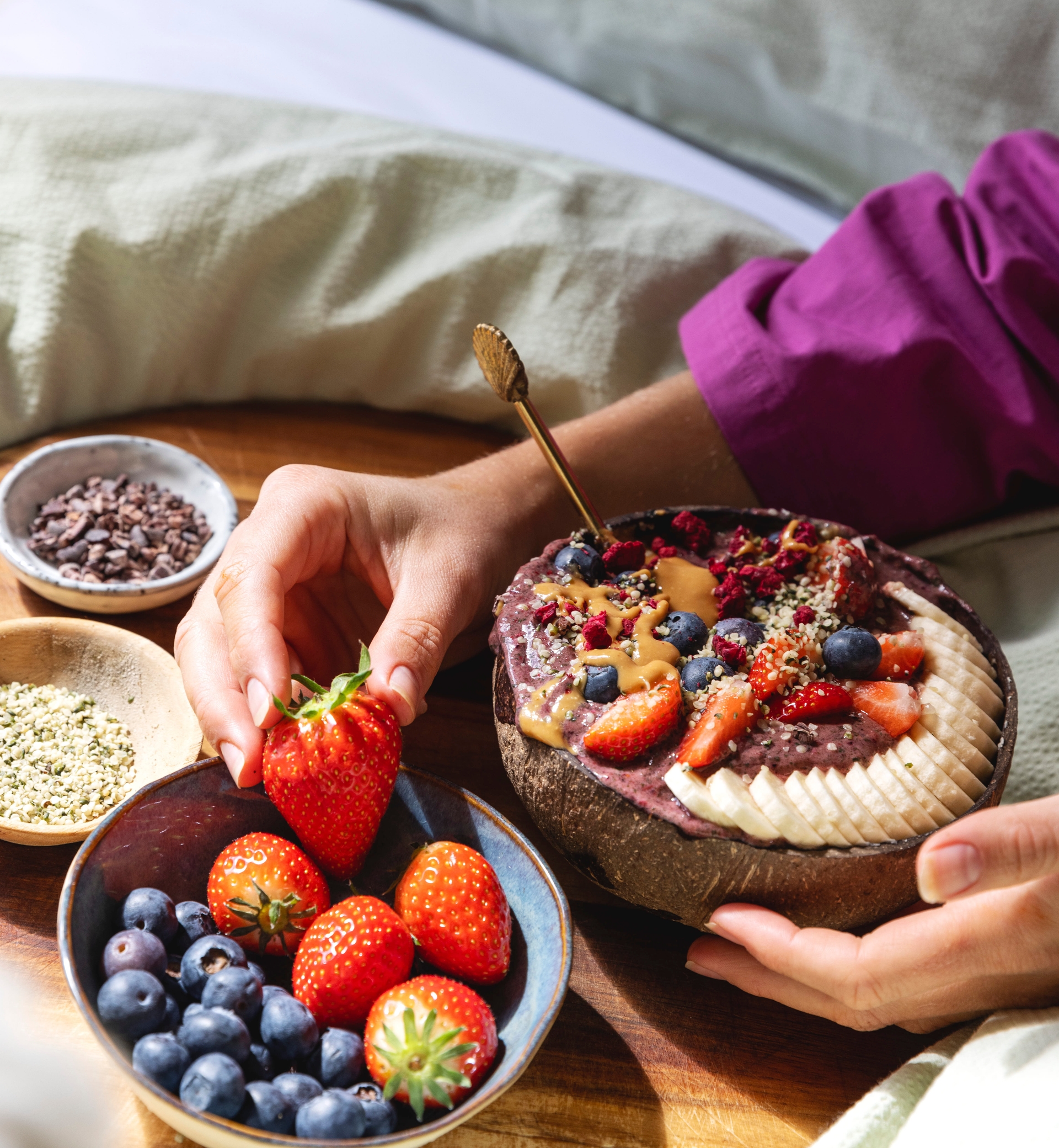 Enhver frokost føles mer luksuriøs når du får den på senga. Jeg elsker å fylle frokostbrettet med fersk frukt og bær, en god kopp kaffe, og for å unngå smuler i senga kan man jo teste ut en fargerik og tjukk smoothie bowl. Så får man gjøre sitt beste for å spise den på en sivilisert måte, haha.