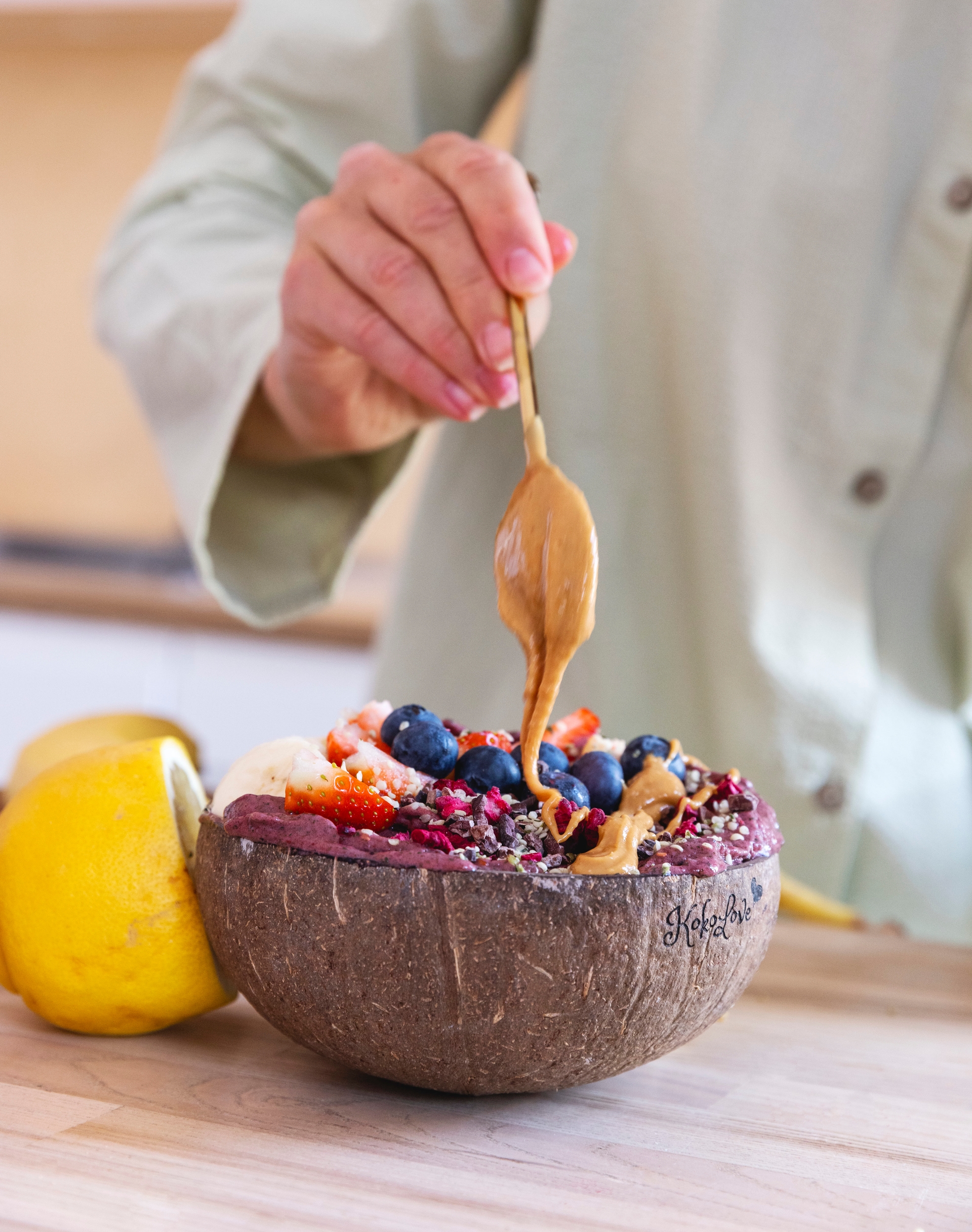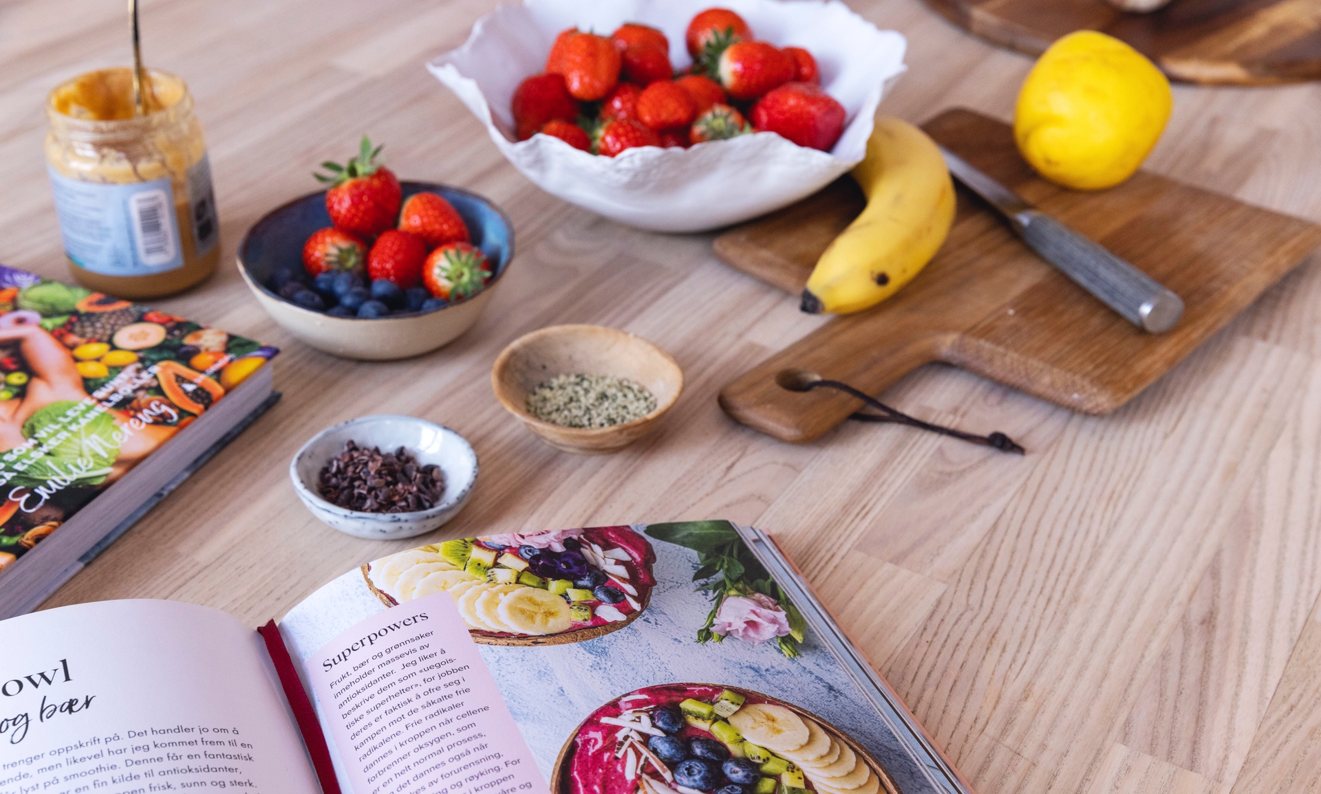 Peanøttsmør, hampfrø, kakaonibs, granola, friske bær og banan