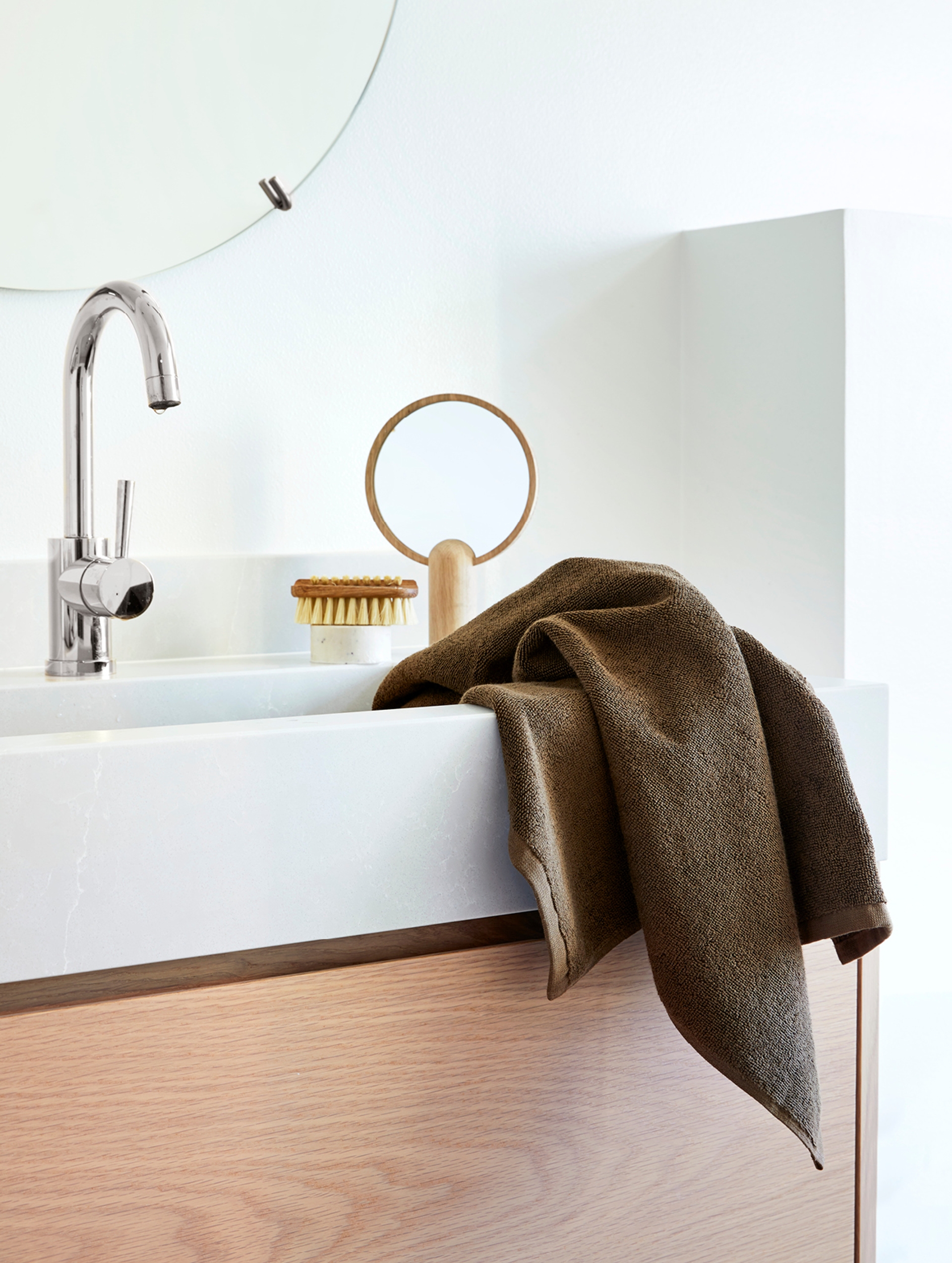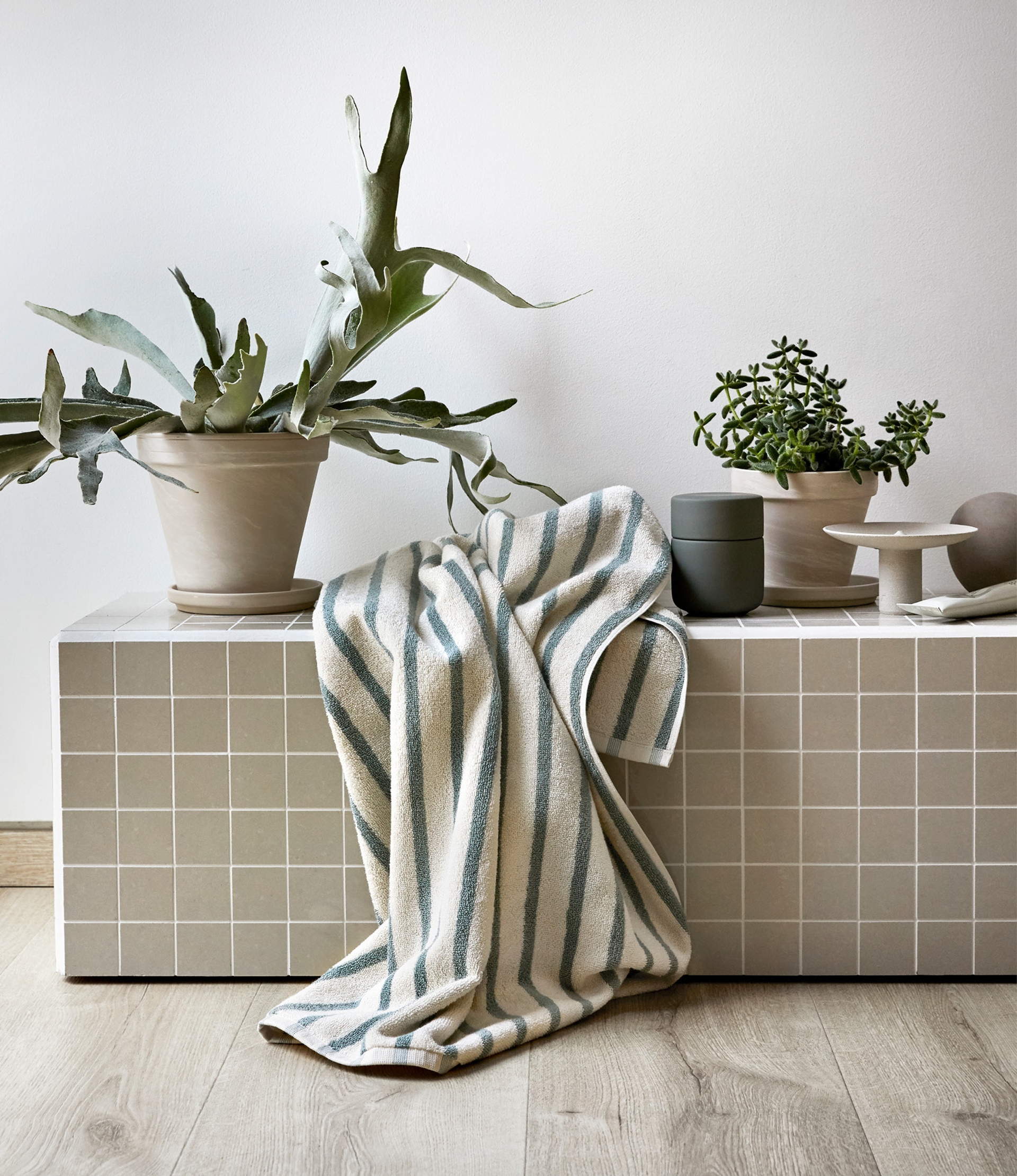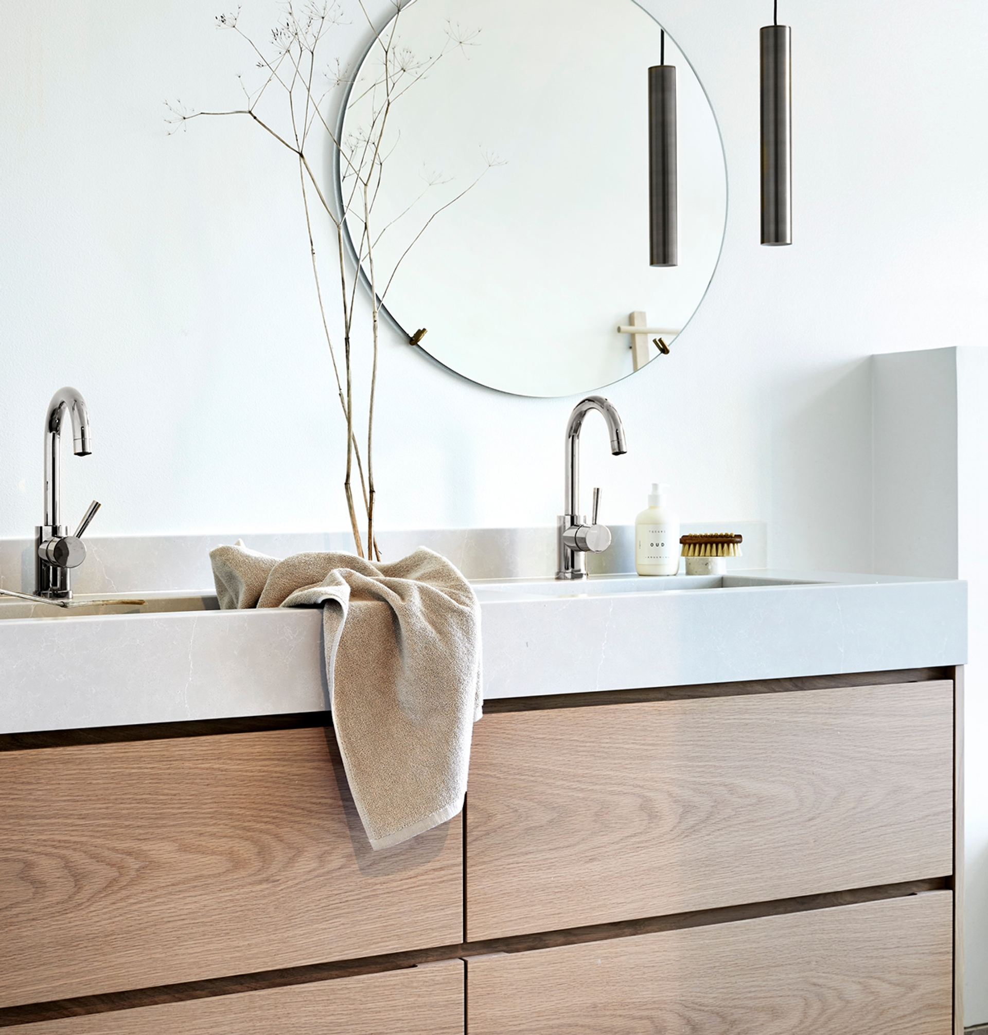 Det skal ikke så mye til, våre favorittelementer er friske blomster og grønne planter! Om du ikke har vinduer med nok lys, duger vaser med blomster, strå eller grønne kvister i. Når du kjøper blomster til hjemmet, ta ut noen kvister og sett de på badet, det gjør utrolig mye med helhetsinntrykket!